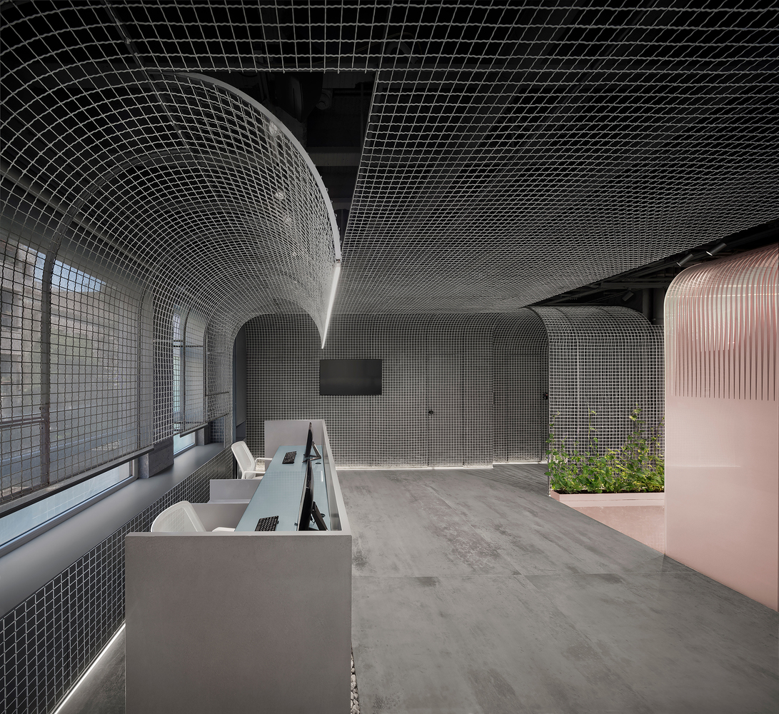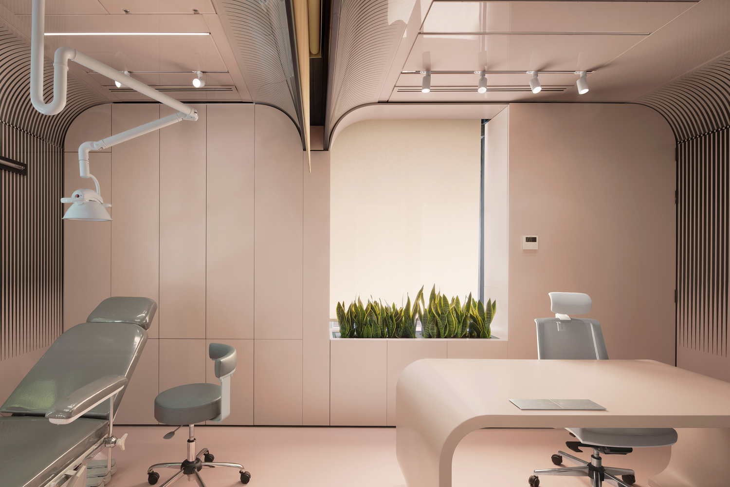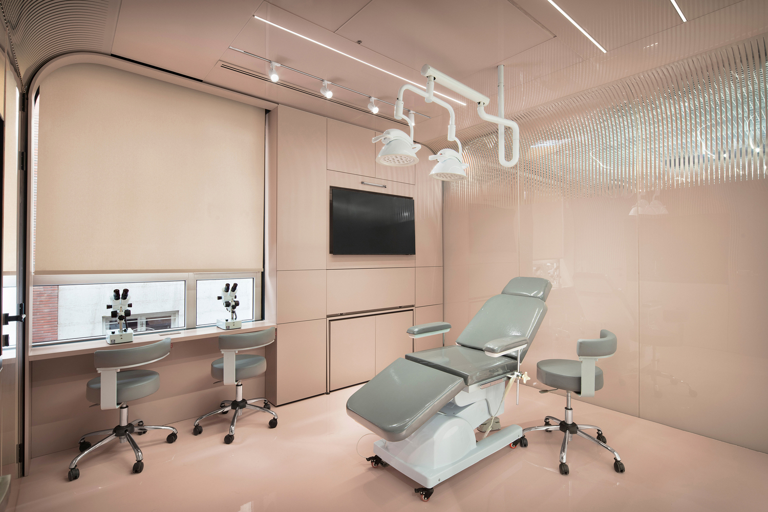 A modern dermatology space where soft pink hues meet muted greys, creating a serene and sophisticated ambiance. This calming palette enhances the experience of care, blending aesthetics with functionality to reflect skin wellness and understated elegance. Dermatology Clinic