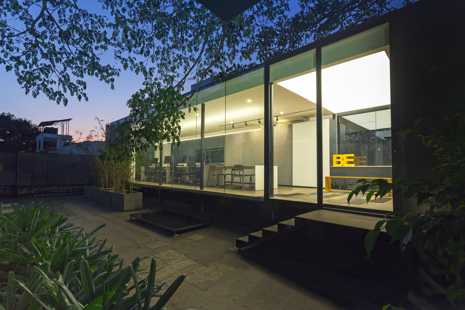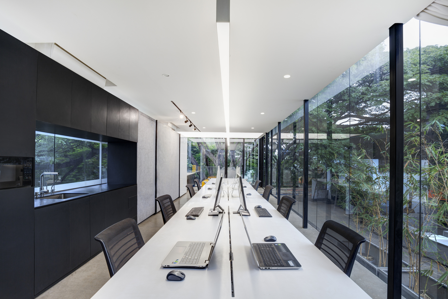 Tucked beneath a canopy of trees, this Glasshouse Office is a transparent, minimalist workspace that blurs the line between indoors and nature. With full-height glass walls, clean lines, and an open-plan layout, it invites daylight, greenery, and clarity into every moment of work. A space designed to be calm, be clear, and be creative where ideas grow as organically as the nature around it. Designers Cafe Kolkata