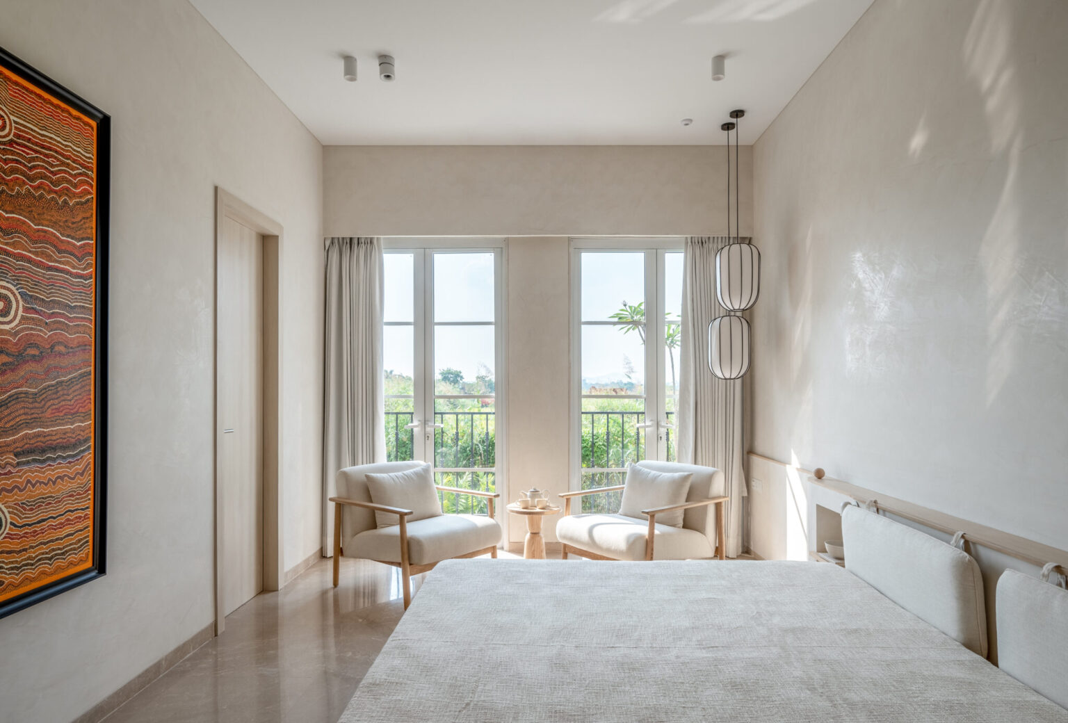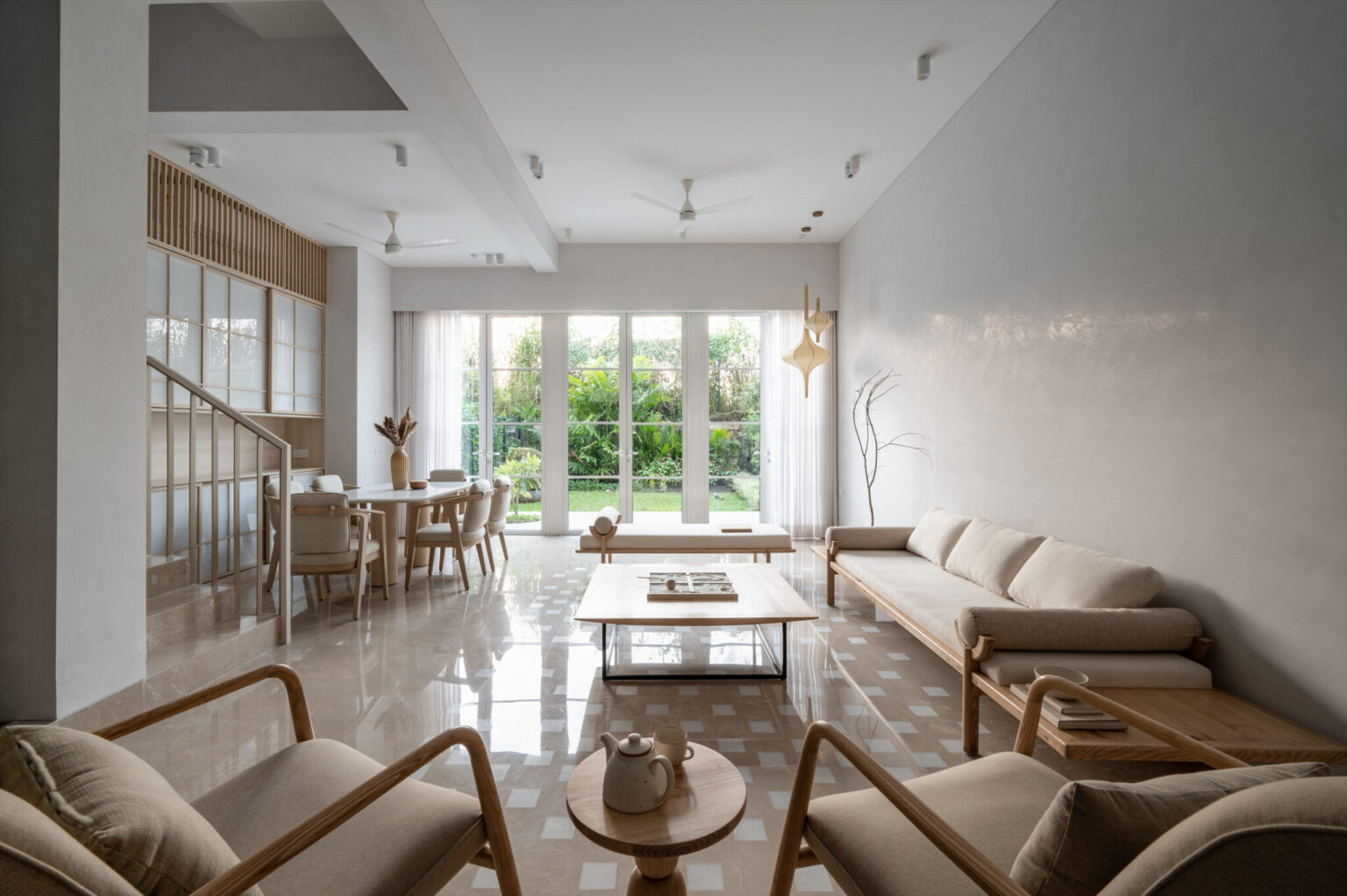 A serene, Zen-inspired home featuring a soaring double-height living space, custom American Ashwood furniture, marble inlay flooring, and a calming palette of lime-washed walls. Ideal for cozy gatherings and elegant entertaining, with subtle Japanese influences throughout. Lodha Belmondo Pune