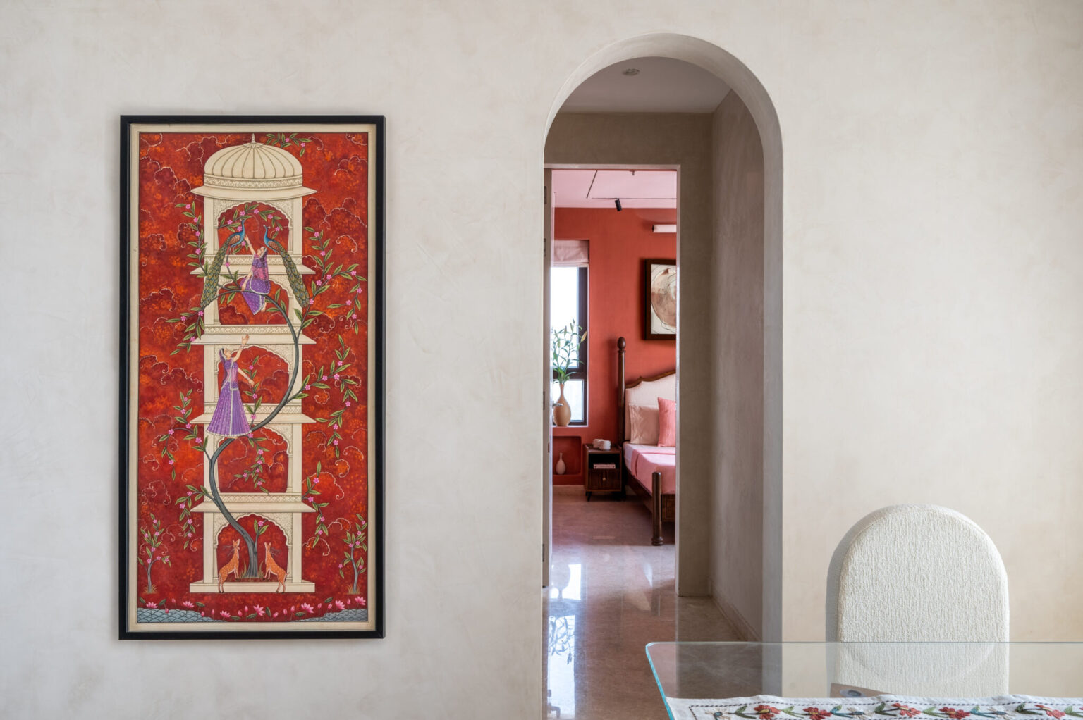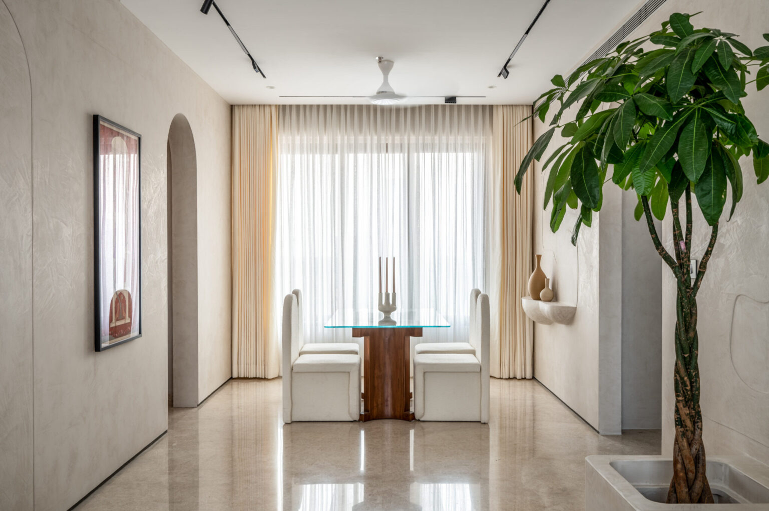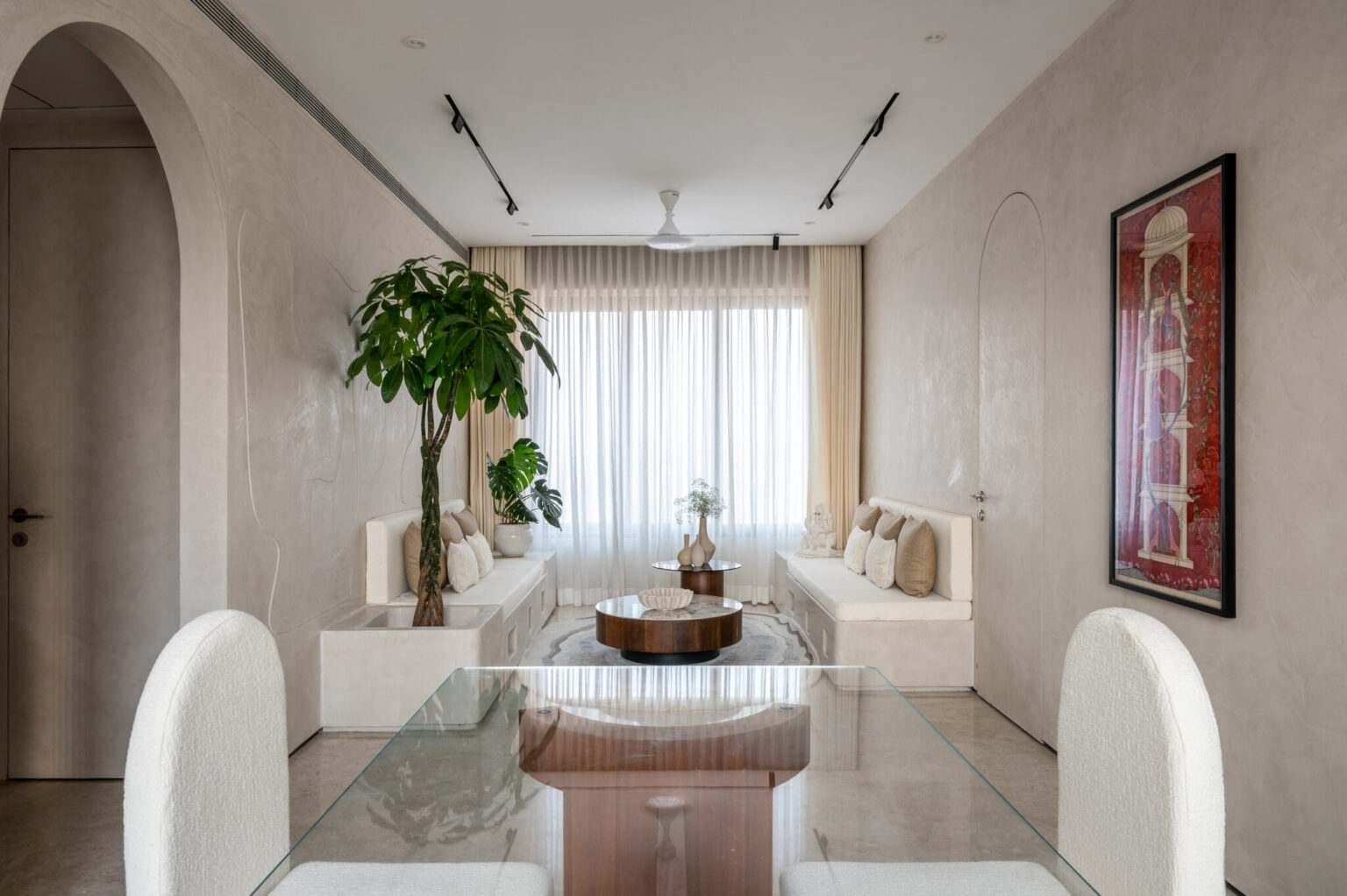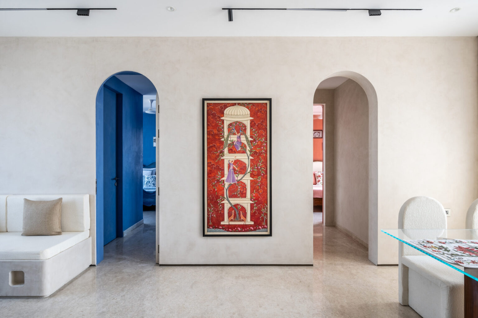 It is a 1800 sq. ft. residence where each room embodies a distinct mood. The living and dining areas exude calm with creamy lime-washed walls, built-in seating, and textured finishes, enhanced by a tall Pachira plant and traditional Pichwai artwork. The terracotta-toned room radiates warmth with earthy lime plaster and wood accents. The master bedroom features moody blue lime-washed walls and a vintage French-style bed, while the den brings a fresh touch with sage green hues and is filled with books and travel mementos. This home is a vibrant interplay of color, texture, and personality within a minimalist shell. Queen Bliss Seawood