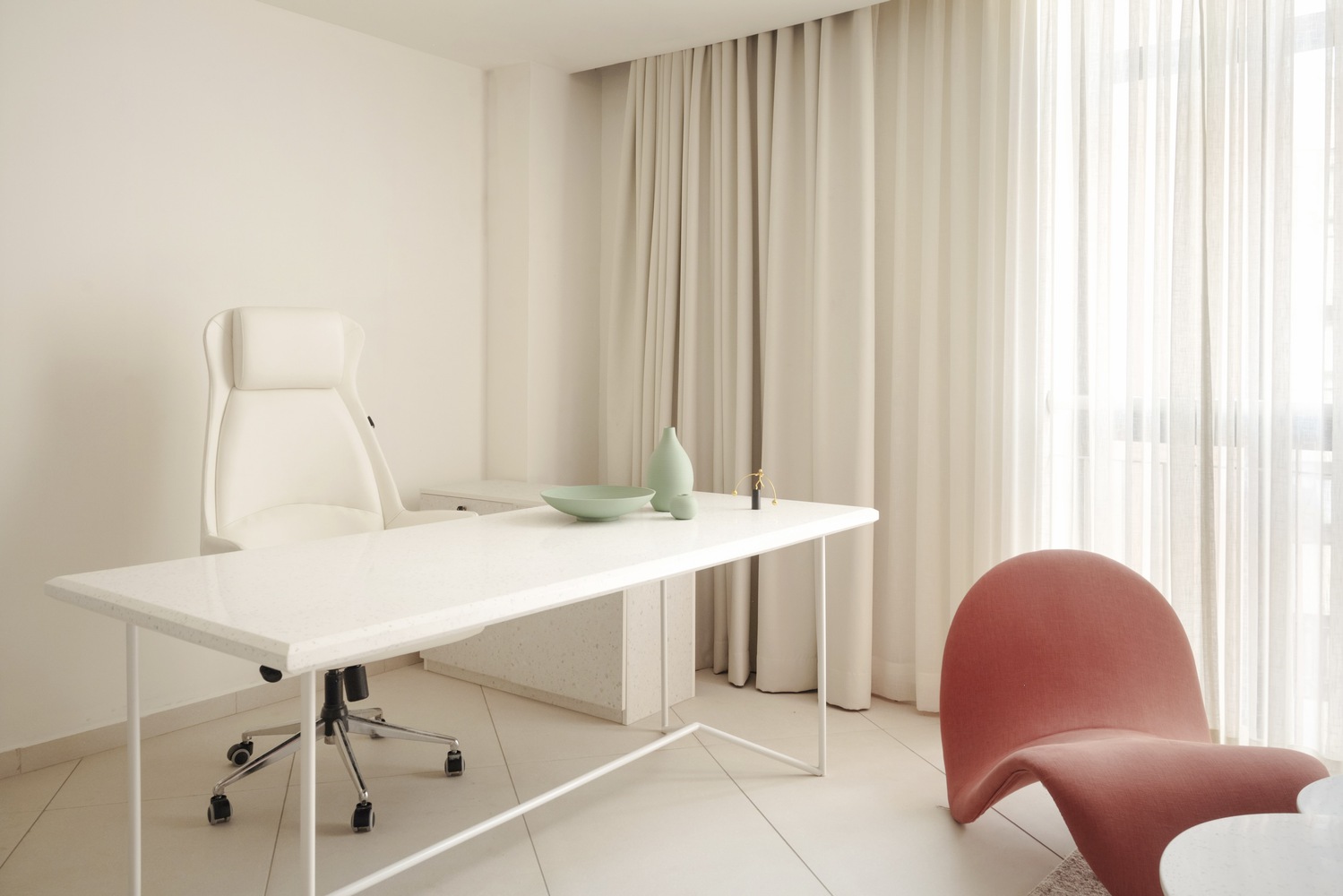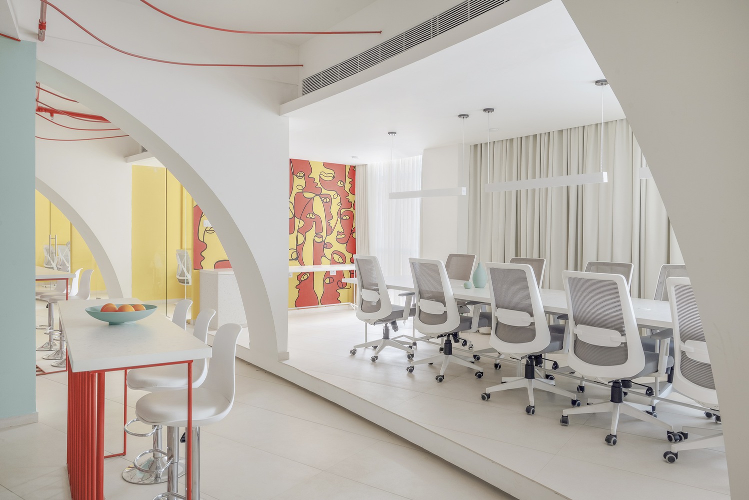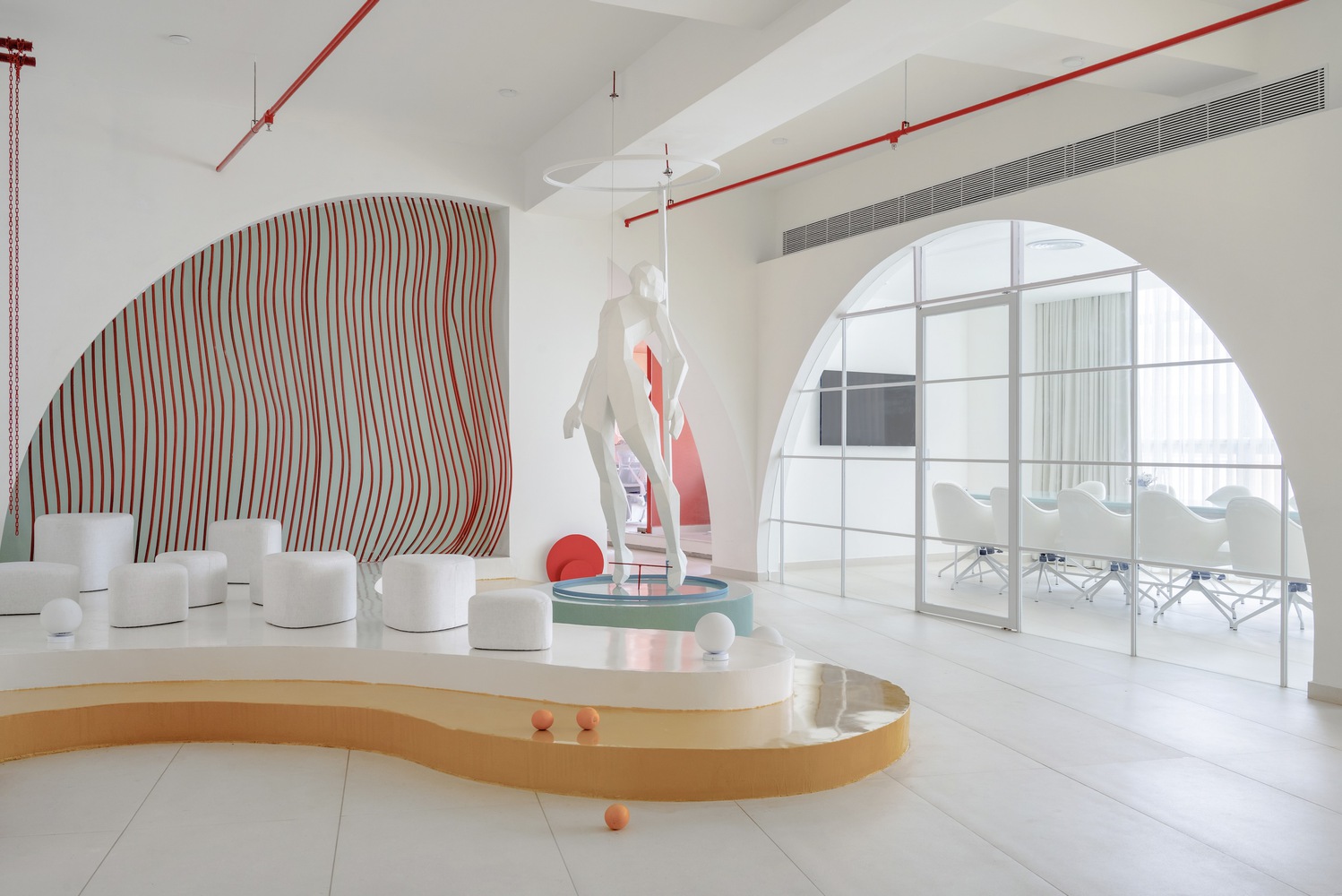 This tech campus redefines the workspace with a playful spirit and soft, sculptural energy. Fluid red lines weave through arched corridors, guiding motion and sparking curiosity. A pastel-toned palette meets ergonomic design, fostering a bright, collaborative environment where innovation feels effortless and learning comes alive. Tech Campus Gurgaon